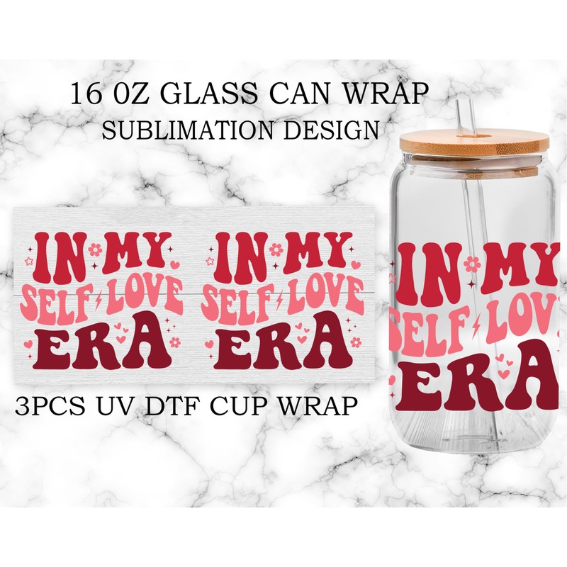 UV DTF Glass Cup Wrap Transfer Decal -3PCS ' in My Self Love Era ' Craft Transfers, Waterproof Decal for 16oz Glass Cups, Furniture, and Wood - Ceramic Mug DIY Crafts