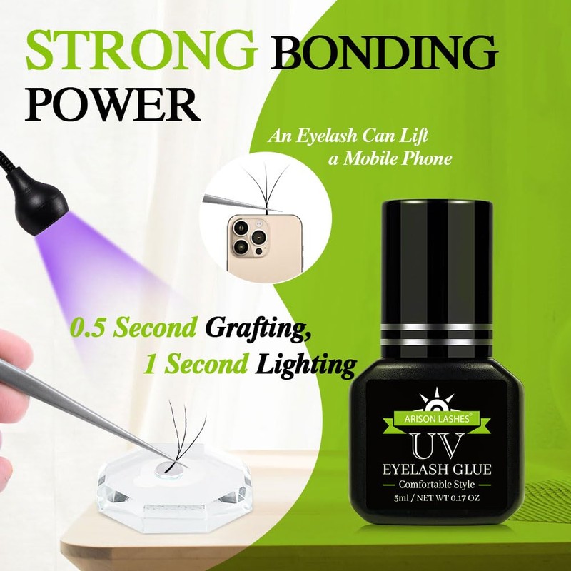 • ✅Designed with cutting-edge technology, this adhesive is your key to achieving stunning, long-lasting lash extensions.Advanced UV Curing: Experience the future of lash bonding with our UV-cured formula. UV Eyelash Glue Super Fast with only 1 second drying time – exclusively for eyelash extensions with UV light.With a quick exposure to ultraviolet light, our adhesive transforms into an unbreakable bond that ensures your lash extensions stay in place for weeks
