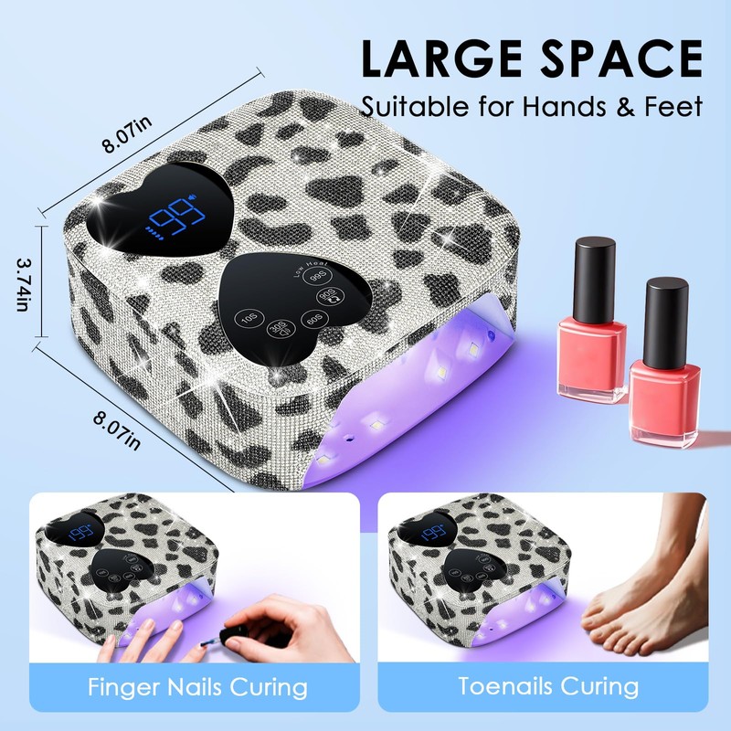 - 𝟓 𝐓𝐢𝐦𝐞𝐫𝐬 & 𝐒𝐦𝐚𝐫𝐭 𝐒𝐞𝐧𝐬𝐨𝐫: Our Cordless LED Nail Lamp comes with a large smart heart-shaped full-touch display. There are 5 timers setting on the screen (10s, 30s, 60s, 90s, 99s, you can select the desired curing time with just one touch. Our diamond glitter nail light has intelligent infrared sensor function, hand in, lamp on, hand out, lamp off, fully automatic curing process frees your hands and offers you a new salon nail experience.