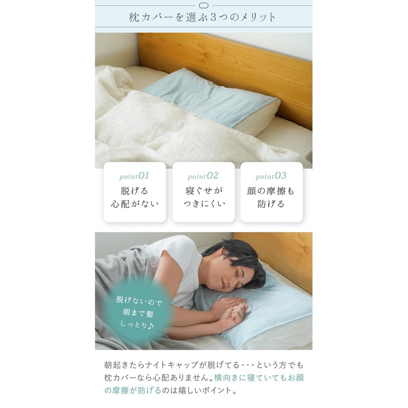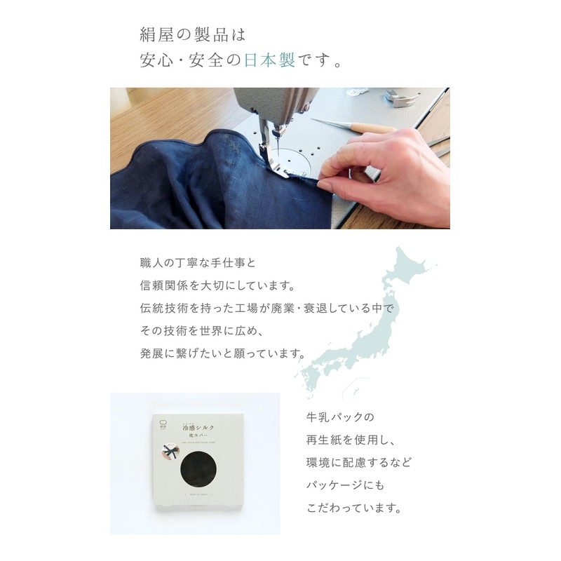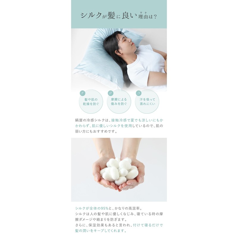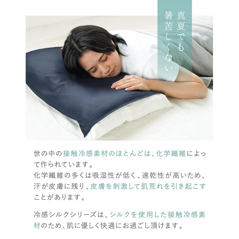- 【天然繊維の接触冷感】世の中の接触冷感素材のほとんどは、化学繊維によって作られています。化学繊維の多くは吸湿性が低く速乾性が高いため、汗が皮膚に残ることで皮膚を刺激して肌荒れを引き起こすことがあります。“冷感シルクの枕カバー”は、シルクをふんだんに使用した接触冷感素材のため、肌に優しく快適にお過ごしいただけます。