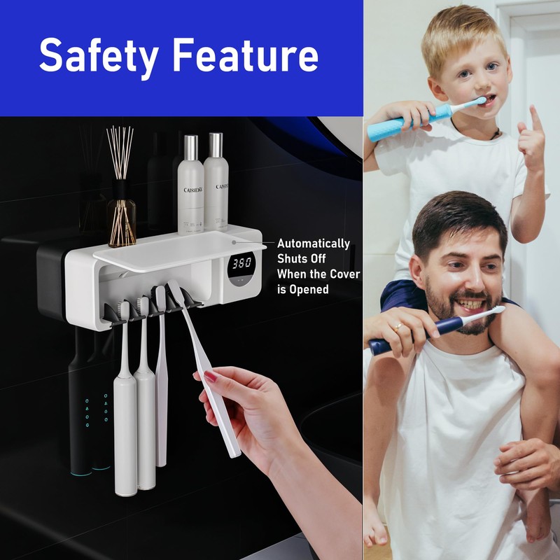 - Convenient 4-Slot Design: This Sanitizing Toothbrush Holder is ideal for family use, with space to hold up to 4 toothbrushes. Whether you use electric or manual toothbrushes, it provides a neat, accessible solution for organizing them. The versatile slots are suitable for various sizes, including children’s toothbrushes, ensuring everyone in your household has their own space. The wall mount design fits perfectly in your bathroom, keeping toothbrushes organized and ready for use.