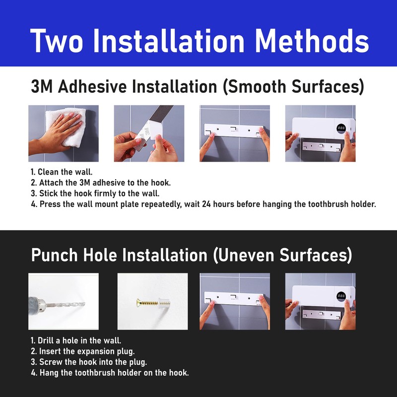 Easily install the holder using 3M adhesive for smooth surfaces or screws for a more secure fit on rough walls, offering flexibility in placement. UV Toothbrush Sanitizer can be mounted anywhere in the bathroom, offering flexibility in placement.