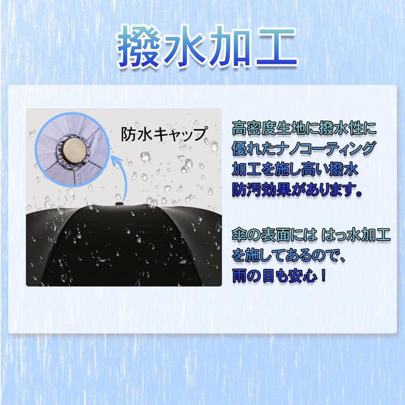 【UVカット完全遮光&超撥水】通常の生地より高密度なので、その表面は非常に細く、水滴を吸収することなく弾きます。 そのため、水切れがとても良く、傘を差した後は軽く振っていただくだけで水気が飛び、カバンにも気楽にしまうことが可能。 また、生地の網目が細かいのでUV加工のコーディングものりやすく、薄めで軽量でありながらUVカット率は100%、UPF50+、完全遮光の高機能が保証できます。 一年中季節問わず使うことができ、梅雨対策にもUV対策にも欠かせない優秀なアイテム!