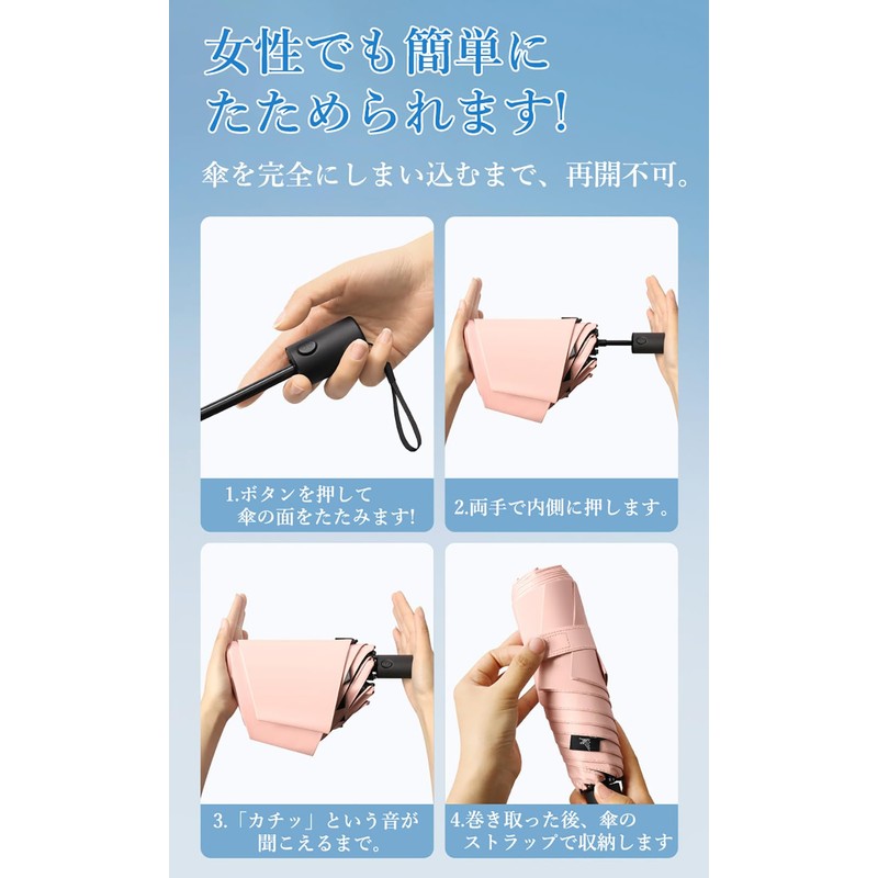 - 【逆戻り防止安全設計】当社の傘は、従来の自動開閉式折りたたみ傘に潜むバネの逆戻りリスクを完全排除する独自設計を採用しています。安全ロック機構を内蔵することで、強く押し込む必要なく、段階的に安全に閉じることが可能です。途中で手を離しても誤作動する心配がなく、任意の位置で停止可能な安心設計です。この段階的閉鎖機能により、顔や体への衝撃を最小限に抑え、使用時の安全性を大幅向上させています。男女問わず、老若男女誰でも簡単に操作できる設計で、力を要せず片手で閉じることができます。