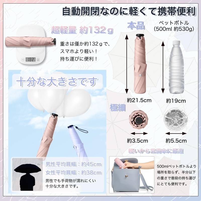 • ☂️【コンパクトで携帯便利】 女性の方でも気楽にご利用いただけるため、軽量化した6本骨にしました。開いた時の直径は91cmという大きいサイズですが、重さはわずか120g。更に、折りたたむ時の長さは22cm。小さいバッグにも納める携帯できるスリムサイズで急な雨に降られても安心です。