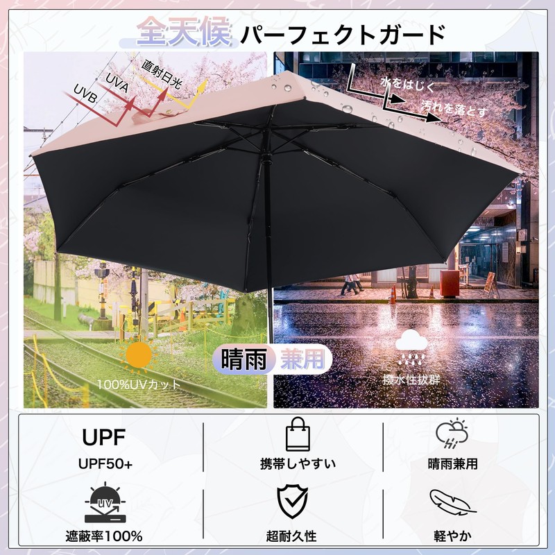 • ☂️【完全遮光&日焼け止め】高密度傘生地と厚い黒ノリコーティングを採用して、UPF50+、UVカット率99%、完全遮光、効果的に日焼け止めすることができます。真夏の強い日差しを遮り、紫外線からしっかり肌を守り、日焼け防止、熱い日差しの中でも涼しく過ごせます。ご注意:傘を開く時、ボタンを押さないでください。両側を握ってください。