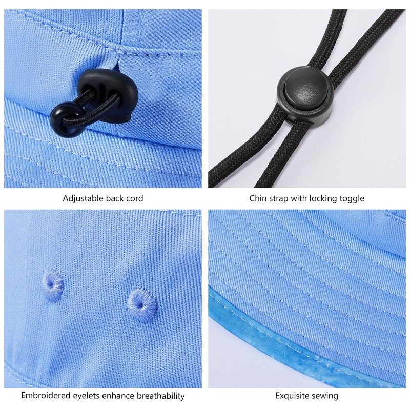 • Drawstring at the back for adjustable sizing; Removable chin strap with locking toggle for windy days; Sweatband prevents sweat from getting into your eyes