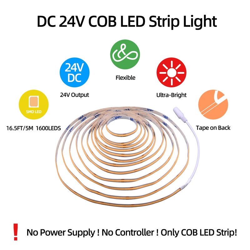 - 24V Power Input: Powered by a cob led strip light 24V input, this LED strip achieves a maximum power of 72W for 5 meters 16.4ft and an impressive brightness of 5000 lumens. We recommend using at least a 24V 3A power supply