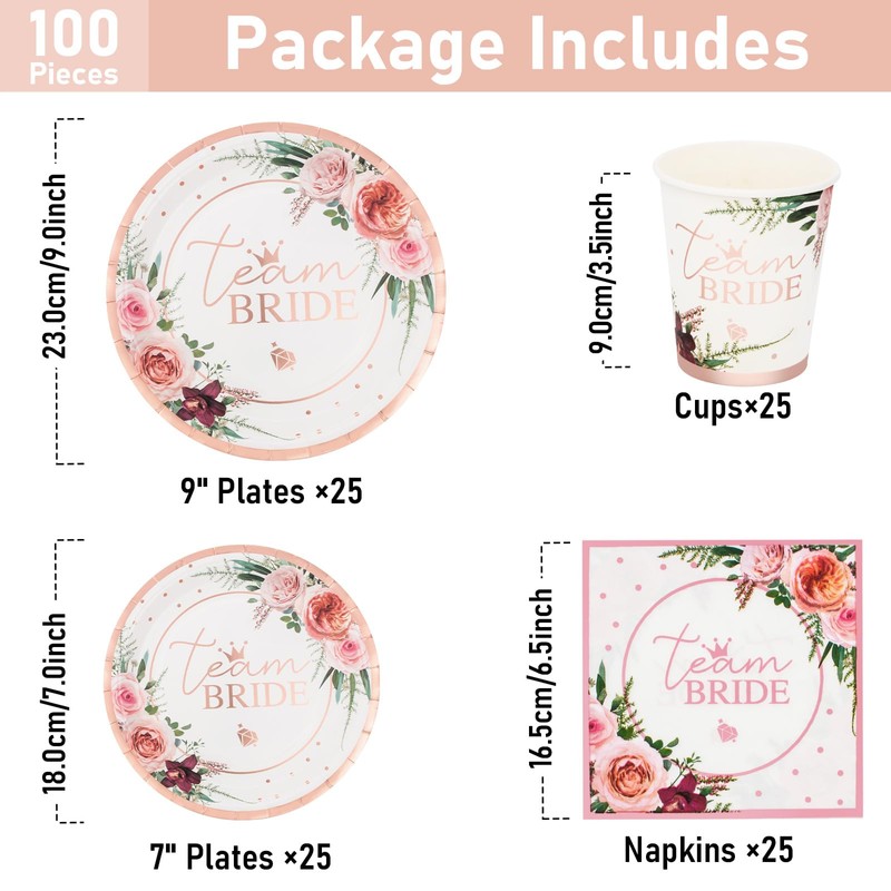 - Bride Team Theme Design: The perfect blend of elegance and practicality! This complete tableware set includes beautifully designed floral plates, cups, and napkins featuring delicate floral patterns accented with sophisticated rose gold foil edge and printed "Bride Team", creating elegant and unforgotten appearance for your special event.