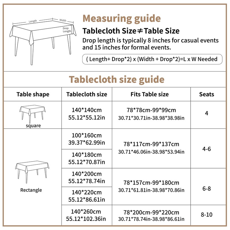 • 【Choose a tablecloth】 Measure the size of the table, it is recommended to increase the table length by more than 20 inches (10 inches on one side) to get a better drop effect. For any size and quality issues with dining table cover , please feel free to contact us. We promise to help you solve your problem within 24 hours