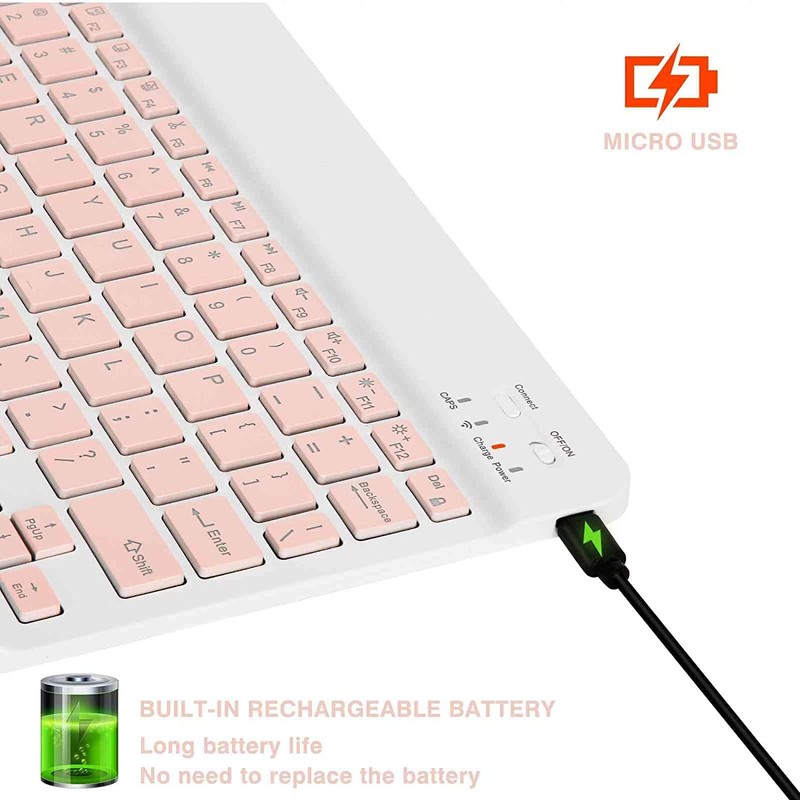 - ECO-FRIENDLY TECHNOLOGY & RECHARGEABLE BATTERIES — The Bluetooth keyboard has a remarkably long-lasting rechargeable battery inside that allows for up to 90 hours of nonstop typing on a single charge. It has an energy-saving mode for environmental conservation that puts the keyboard to sleep after 30 minutes of inactivity to reduce wasteful energy use.