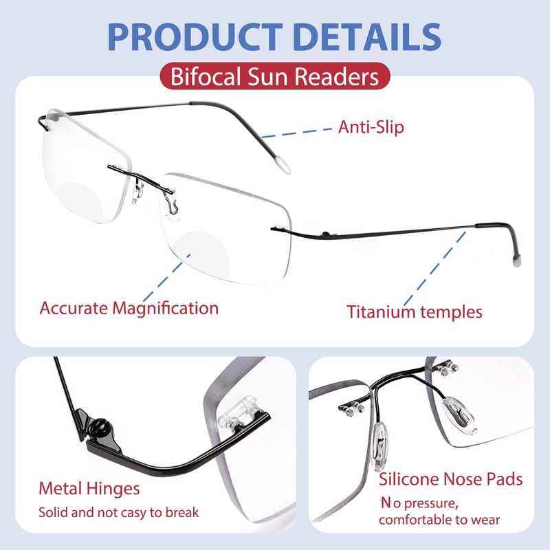 UXAOSVME Rimless Transition Photochromic Bifocal Reading Glasses For Men and Women UV Protection Sunglasses Readers Titanium 2.5