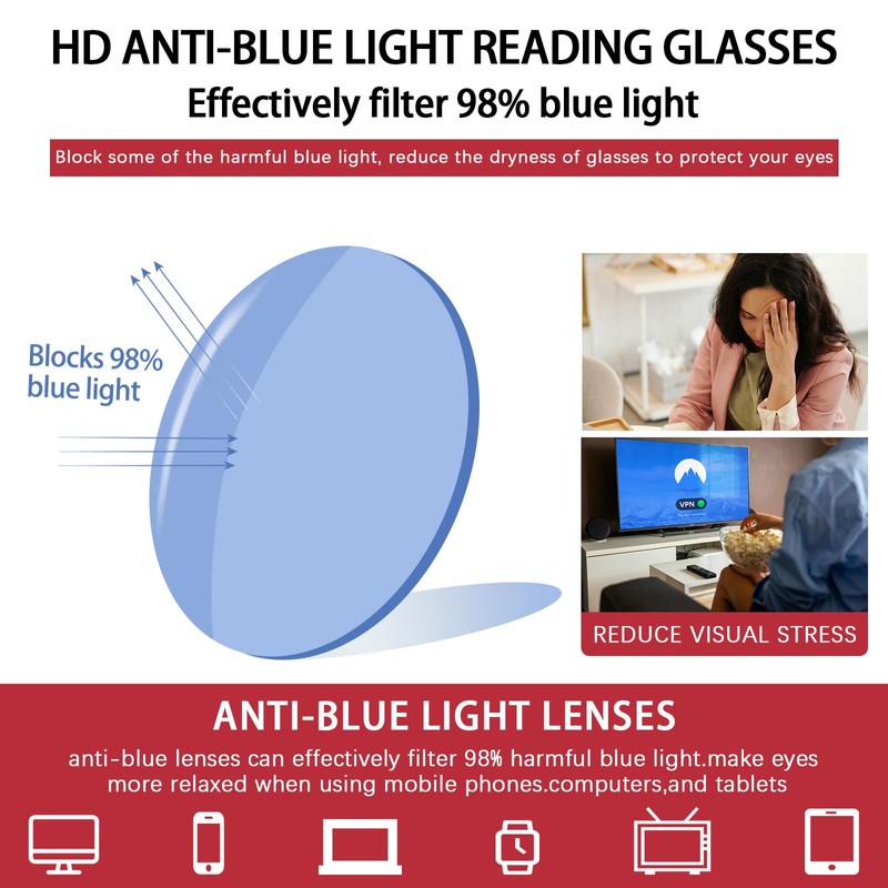 - Blue Light Blocking & UV Protection:Anti-blue light technology,as a key means of modern eye care,people face the screen for a long time.Premium blue blocker and UV protection coating can effectively filter harmful blue light,prevent glare,reduce your eye dryness when using mobile phones,computers and tablets,and indirectly improve sleep quality