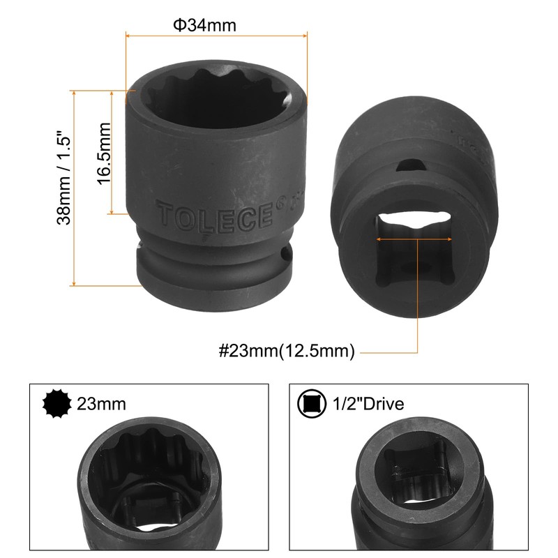 - 【Size】Drive: 1/2-inch, 12-Point Socket Size: 23mm, Total Length: 1.5-inch. The specifications are marked on the surface of the impact socket, which is easy to identify, improving work efficiency.