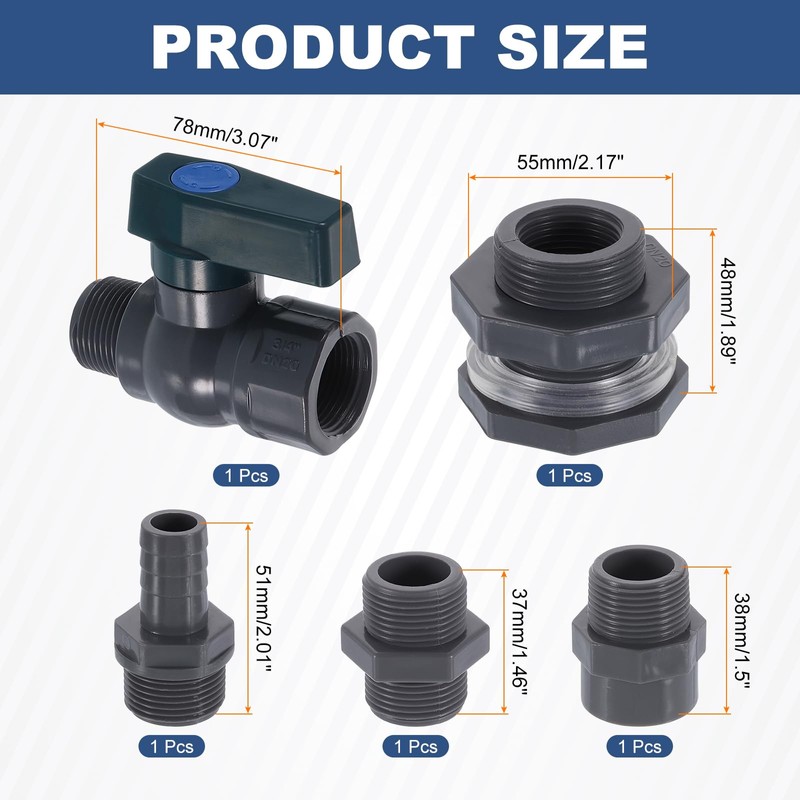 - [What You Get] - The package comes with 1 set of plastic rain barrel faucet kit. Thread Size: 3/4" GHT; Spigot Size: 78 x 40 x70mm/3.07" x 1.57" x 2.76"(L*W*H); Bulkhead Fitting Size: 48 x 55mm/1.89" x 2.17"(L*W); Double Thread Hose Adapter Size: 37 x 32mm/1.46" x 1.26"(L*W); Single Thread Hose Adapter Size: 38 x 32mm/1.5" x 1.26"(L*W); Pagoda Hose Adapter Size: 51 x 30mm/2.01" x 1.18"(L*W).