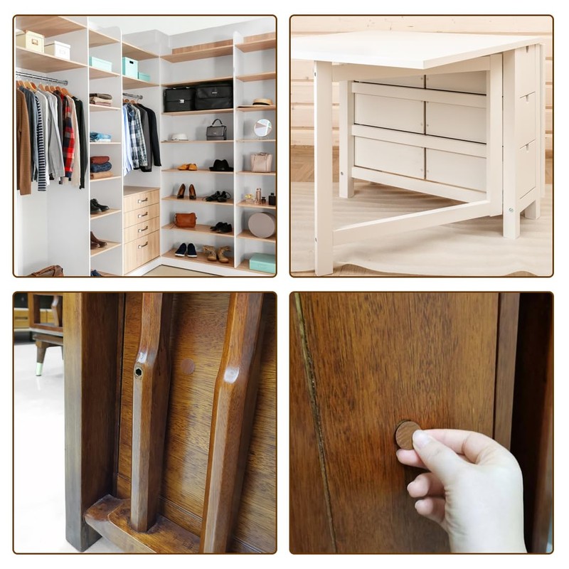 - [Application]: Very suitable for use on wood grain furniture, cabinet stickers, cabinet nail sets, mirror decoration, shelf caps, table hole, lamp hole, building bookcases and other furniture to cover screw holes and mounting holes well. Make your furniture look new.