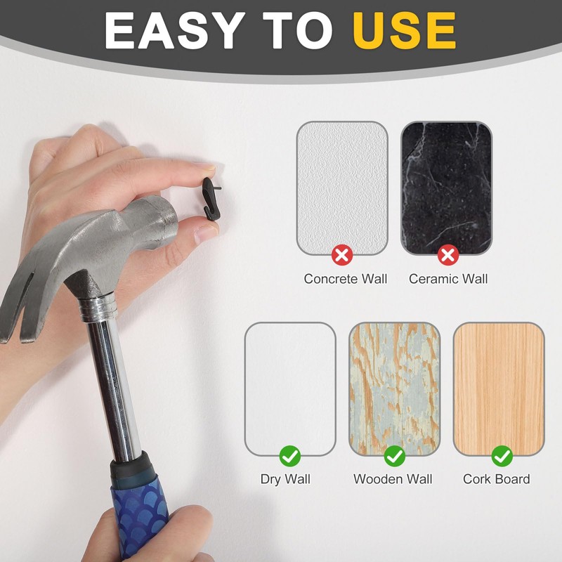 - [Easy to Install] - If it is a corkboard, we can directly press the nail into it with our thumb. If it is a hard wall, it needs to be installed with a hammer until it fits tightly with the plane. They work well on wood wall and drywall, but are not suitable for ceramic or concrete walls.