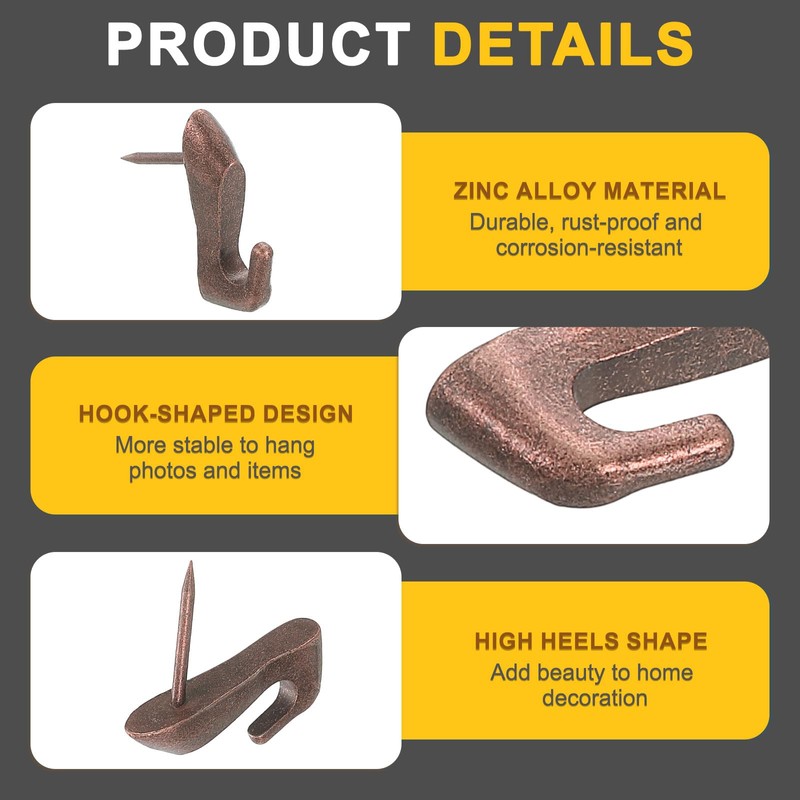 [Hook Shape] - The picture hangers are hook-shaped designs, and the shape looks like high heels, which is very delicate and beautiful, and can better and more stably hang photos, decorations and other items.