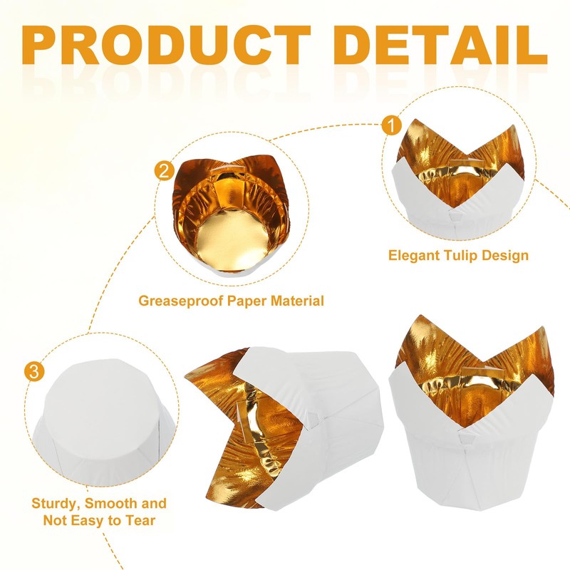 uxcell 100 Pcs Tulip Baking Cups Cupcake Muffins Liners Aluminum Foil Paper Greaseproof Wrappers for Weddings Birthday Party Festivals Christmas, Gold/White