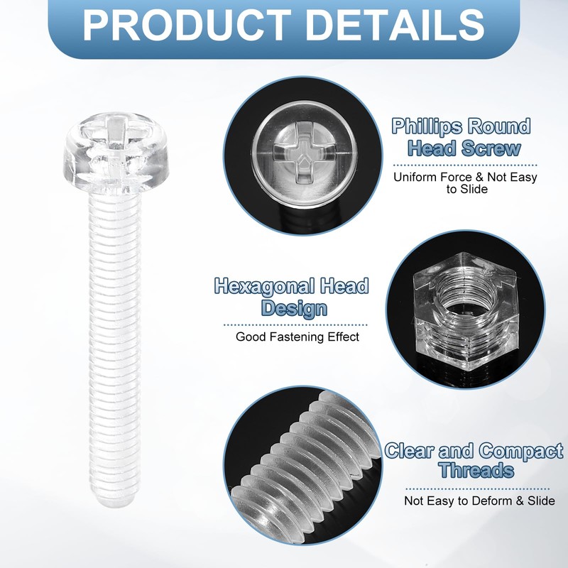- Material: The screws and nuts are made of PC, with durable, transparent, and good thermoplastic structure. These components are lightweight but durable, with good insulation, corrosion resistance, and rust resistance, and can be used for a long time