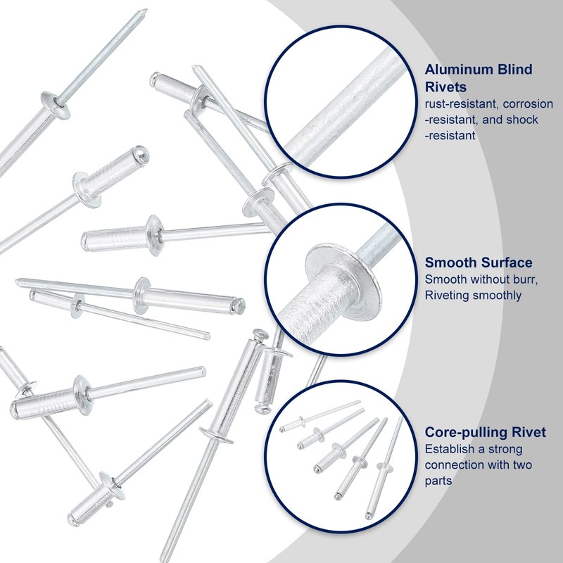 - [EASY TO INSTALL]: The long blind rivets feature a self-plugging open design. Insert the blind rivet head into the pre-drilled hole of the connected parts, and then use a rivet gun to pull the mandrel into the rivet. The rivet can be firmly and stably locked in place