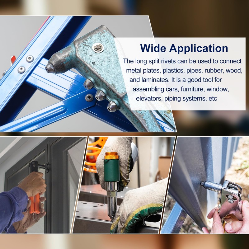 Widely Applicable - The long split rivets can be used to connect metal plates, plastics, pipes, rubber, wood, and laminates. It is a good tool for assembling cars, furniture, window, elevators, piping systems, etc