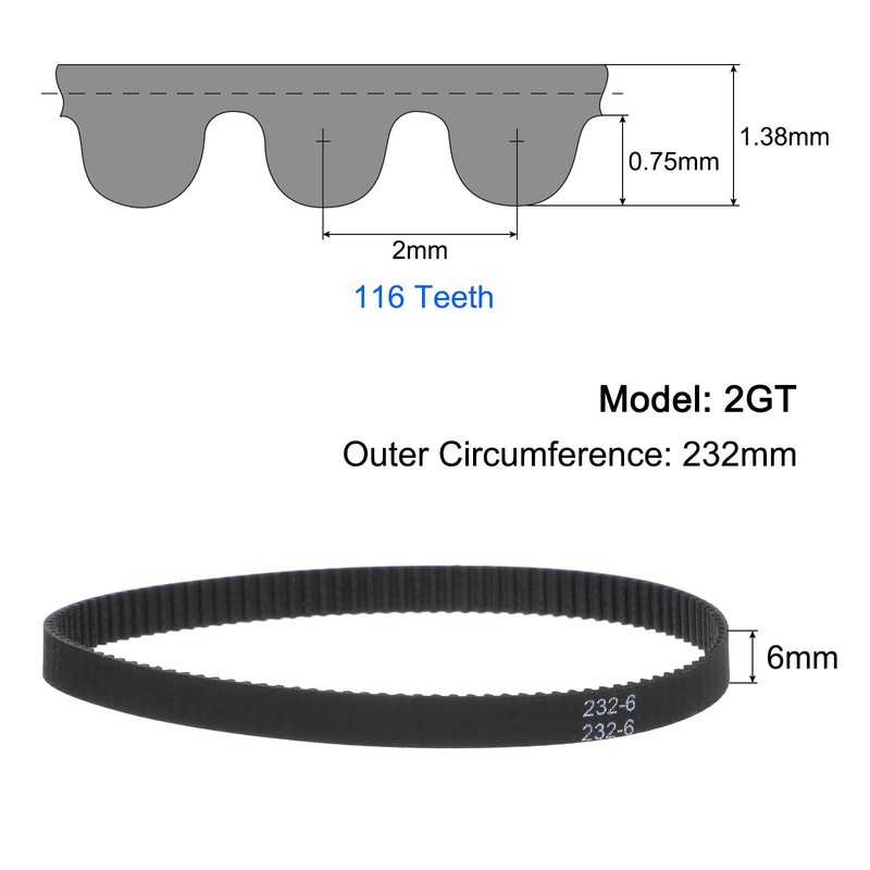 - Size: 2GT timing belt - 6mm Width, 232mm Outer Circumference, 116 Teeth, for better power transmission.