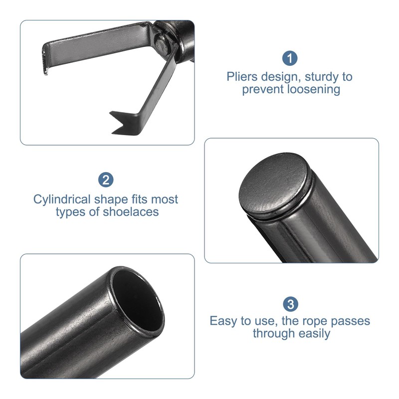 • Easy to Install: Pass the rope through the bell, clamp it with pliers, press it tightly, and push it into the bell buckle to complete the installation. It is strong and not easy to fall off, preventing the shoelaces from loosening. The alloy shoelace head can be easily transferred to other shoelaces as needed.