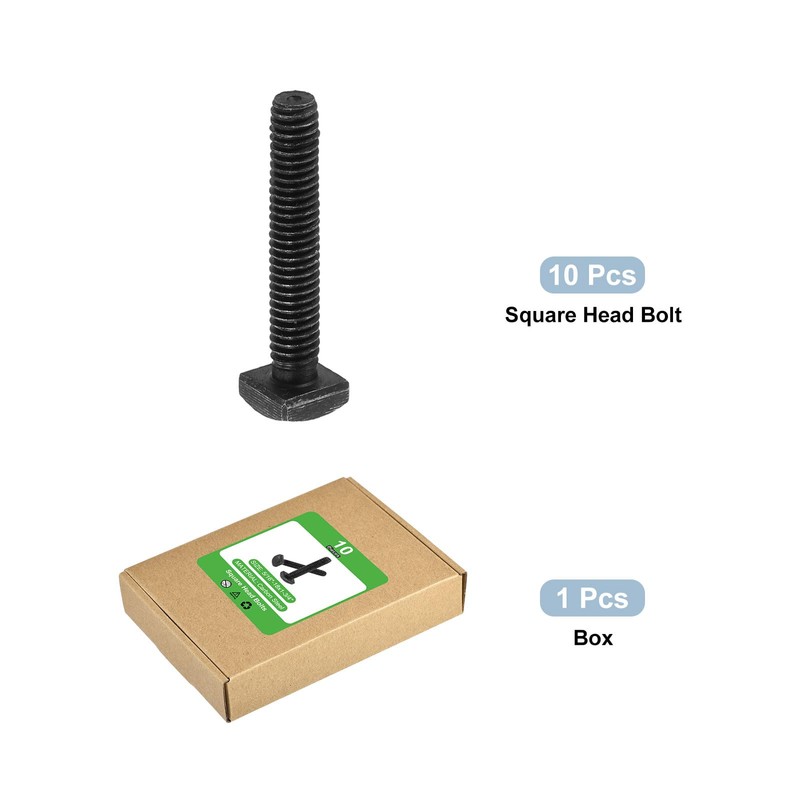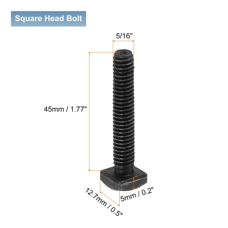 - Square Head Bolt: Surface: Black Oxide; Color: Black; Thread Size: 5/16-18x1-3/4" (D*L); Bolt Length: 45mm / 1.77"; Thread Length: 45mm / 1.77"; Head Size: 12.7mm x 5mm / 0.5" x 0.2" (W*T); Package Content: 10Pcs x Square Head Bolts