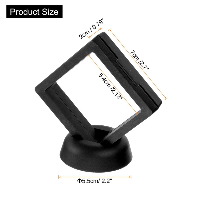 - Package Content: You will receive 12 pcs floating display case and stands. Frame Size: 2.76"L x 2.76"W x 0.8"H; Display Screen Size: 2.1"L x 2.1"W. Color: Black