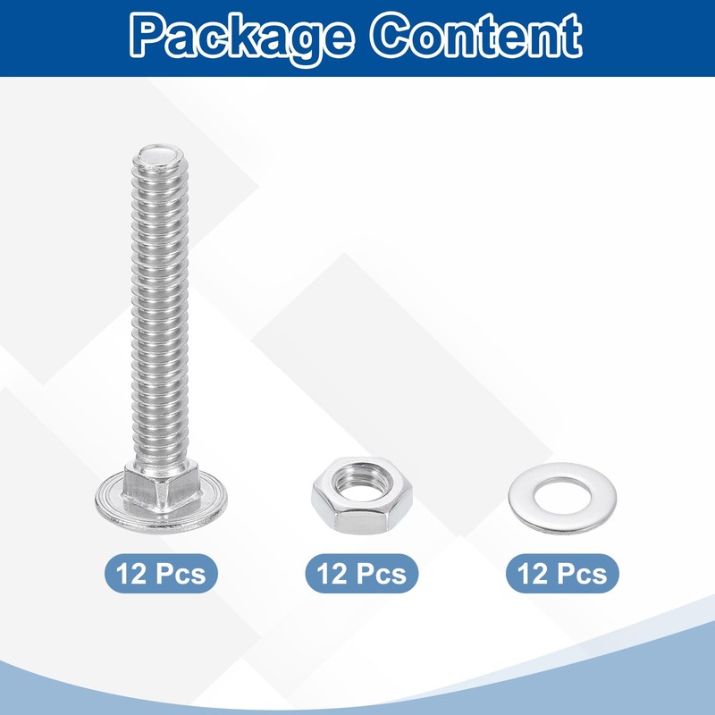 - [Size & Package Content] -Material: 304 Stainless Steel ; Finish: Pickling; Colour: Silver; Thread Size: 3/8"-16x2-3/4"; Thread Pitch: 16 per inch; Bolt Length: 70mm / 2.76"; Head Size: 20.6mm x 5mm/ 0.81"x 0.2"(D*T); Square Neck Width: 9.5mm / 0.37"; Flat Washers: 7.1mm x15.8mm x1.6mm / 0.28"x 0.63"x 0.06"(ID*OD*T); Package Content: 12Set x Carriage Bolts Screws