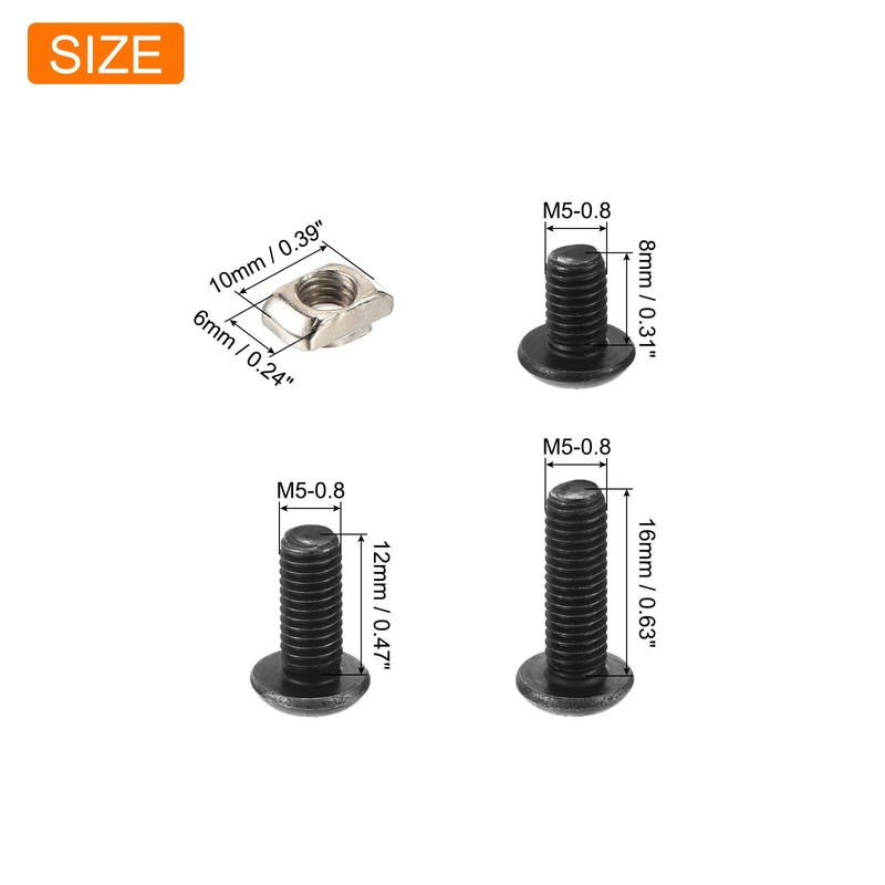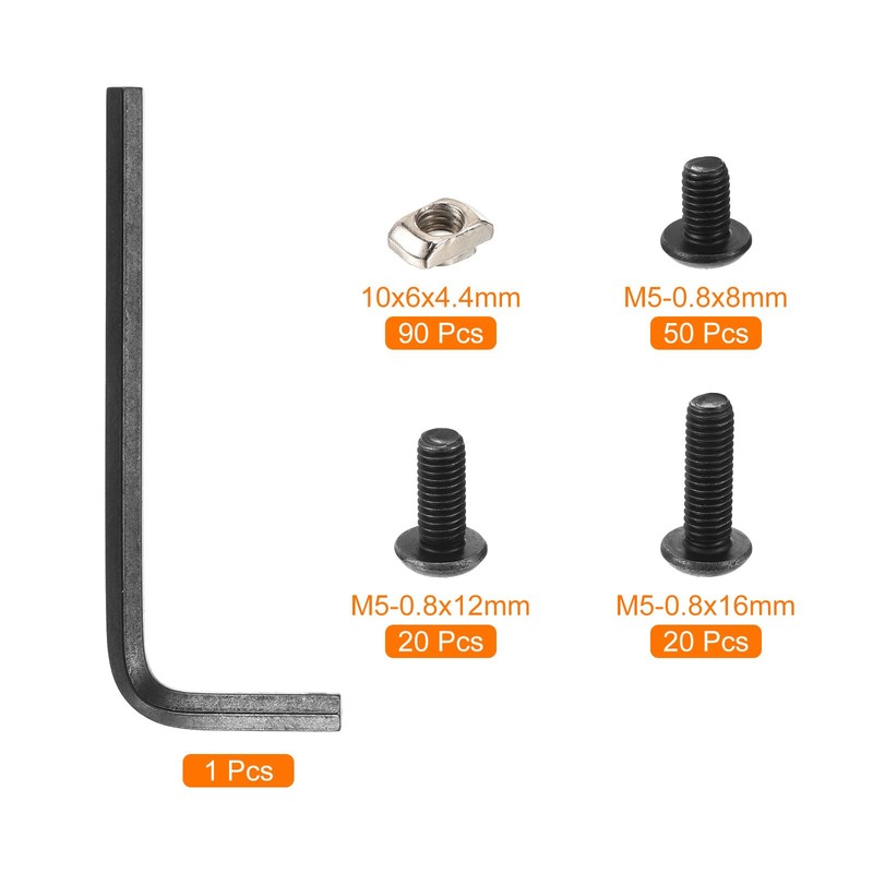 - Specification: Material: Carbon Steel; Thread Size: M5-0.8; T Nut Size: 10x6x4.4 mm / 0.39x0.24x0.17 inch (LxWxT) -40Pcs; T Sliding Nut Size: 11x10.2x5mm / 0.43x0.39x0.20 inch (LxWxT) -40Pcs; Hexagon Socket Screws Length: 10mm/0.39inch -40Pcs; Hexagon Socket Screws Length: 10mm/0.31inch -40Pcs; Washers x 40Pcs