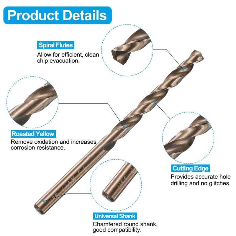 ツイス トドリルビットは、ス パイラルフルートチップスペース設計を採用して、チップを迅速かつきれいに除去します。切れ刃はきれいで滑らかな切断を提供します。適切な潤滑剤(切削液または油など)を使用して摩擦と熱の発生を減らします。