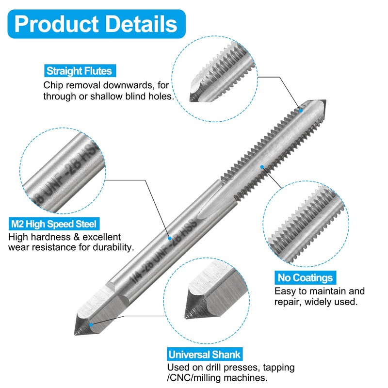 - タップ&ドリルビットセット: 2個 1/4-28 UN F(右巻き)スレッドタップと2個 5.5mm(右巻き)ドリルビット。6542(M2)高速鋼タップは、高い硬度、優れた靭性、耐摩耗性および耐熱性を提供し、耐久性があります。M35コバルト高速鋼ドリルビットは、改良された硬度、耐摩耗性、切削性能、および高い強度を提供します。