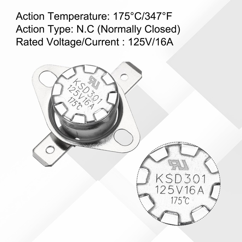 • Type: KSD301 175°C/347°F Thermal Control Switch 125V 16A N.C (Normally Closed)