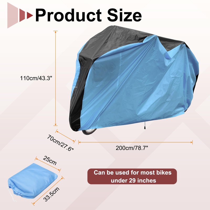 - サイズ - 自転車カバーの長さ:200cm/78.7"、幅:70cm/27.6"、高さ:110cm/43.3"、29"以下のほとんどの自転車に使用可能です。