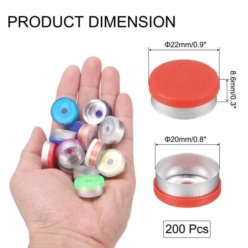 - 製品情報 - 200個のフリップオフキャップが届きます。キャップの内径は20 mm/0.8"、外径は22 mm/0.9"、高さは9 mm/0.4"です。