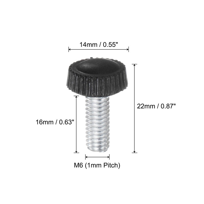 - Knurled Knob Size: Thread Size: M6 (1mm Pitch); Thread Length: 16mm / 0.63"; Round Head Diameter: 14mm / 0.55"; Total Length: 22mm / 0.87"; Color: Black