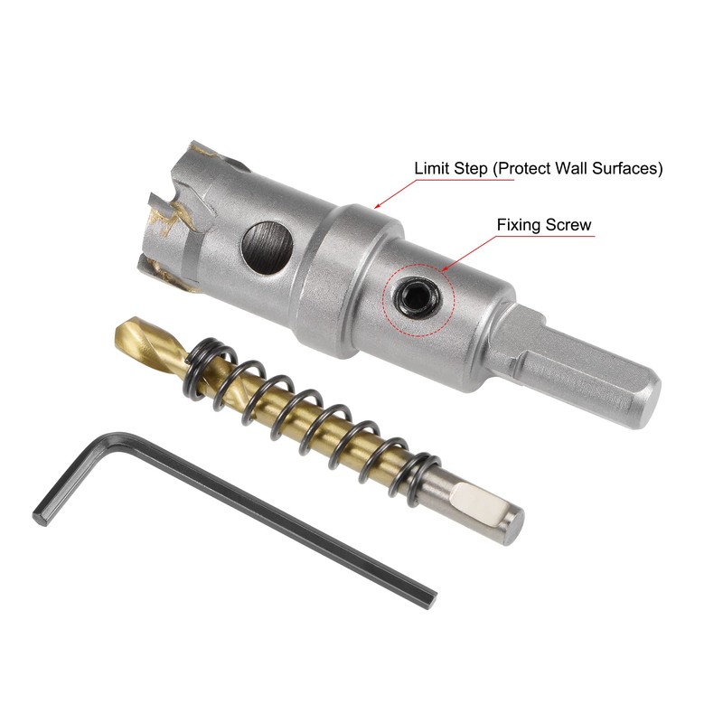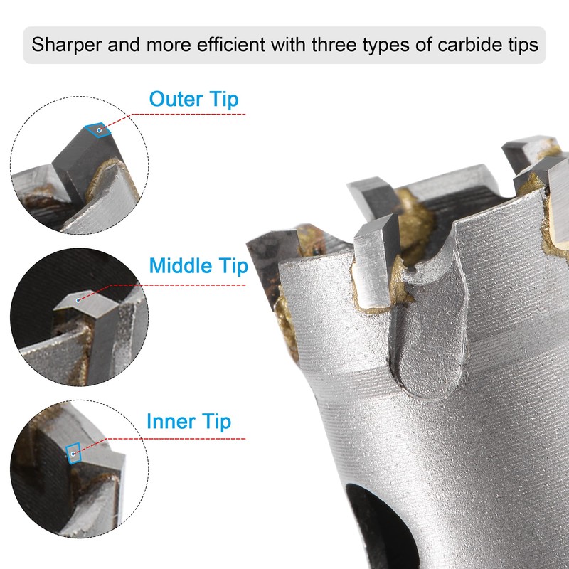 - All In One: Drill bit, spring, wrench are included. No need to buy any extra accessories for the drilling works. Sharper and more efficient with three types of carbide tips (Outer Tip, Middle Tip, Inner Tip).