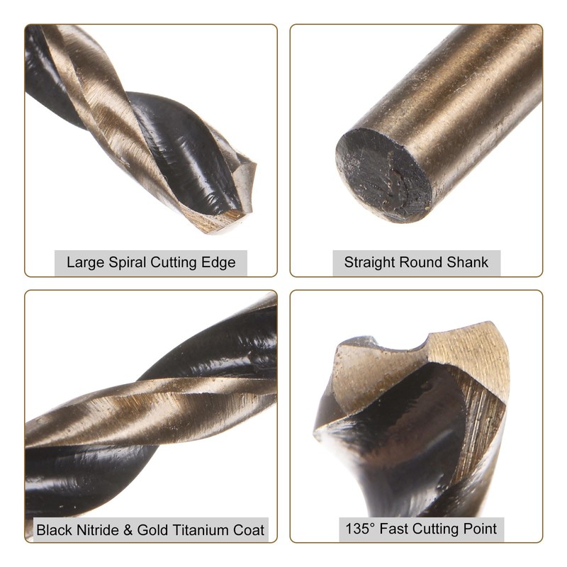 - Black & Gold Finish: Black nitride and gold titanium dual coatings can apply lubricant better for smoother drilling and are more durable and corrosion resistant. Sharp cutting edges provide neat and smooth cuts. Large spiral grooves facilitate the export of metal chips.