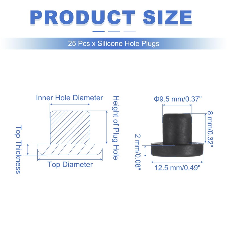 - Package & Size: The package includes 25 pcs silicone hole plugs, the inner hole diameter is 9.5 mm/0.37 inch. Due to manual measurement, there may be +/- 1-2mm errors in size and slight color deviations due to different batches.