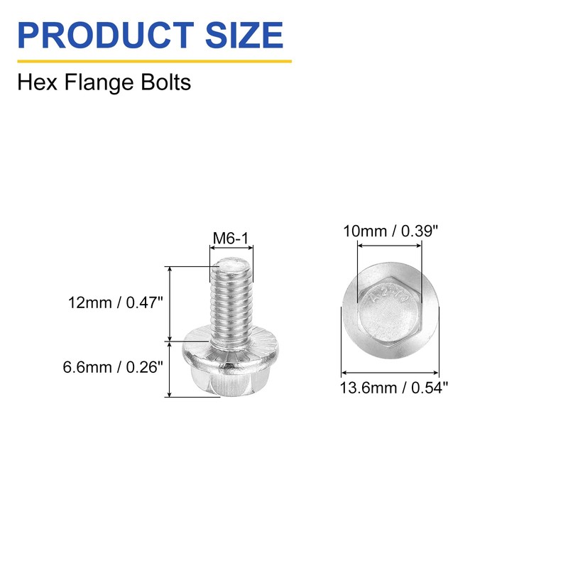 - Dimension: M6 x 12mm; Rod Length: 12mm / 0.47"; Pitch: 1mm / 0.04"; Flange Diameter: 13.6mm / 0.54"; Hex Width: 10mm / 0.39"; Head Thickness: 6.6mm / 0.26". Package Contains 25 Pieces Hex Serrated Flange Bolts Screws.