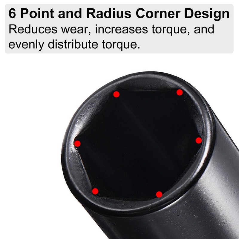 • 6-Point Socket: 1/2" drive socket features a 6-point design, which provides a larger contact area with the fastener than a 12-point design. It helps to evenly distribute torque and reduces the risk of rounding or damaging the fastener. 6-point opening fits snugly against hex fastener heads to apply maximum torque without slipping.
