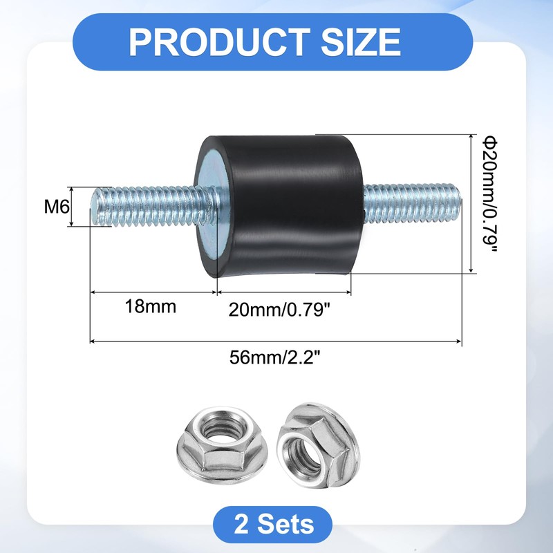 - Size&Package: Surface Treatment: Zinc Plated; Rubber Size: 20 x 20mm/0.79" x 0.79"(D*H); Male Thread Size: M6 x 18mm; Overall Length: 56mm/2.2"; Package: 2 x Isolator Mount, 4 x Serrated Flange Hex Nuts