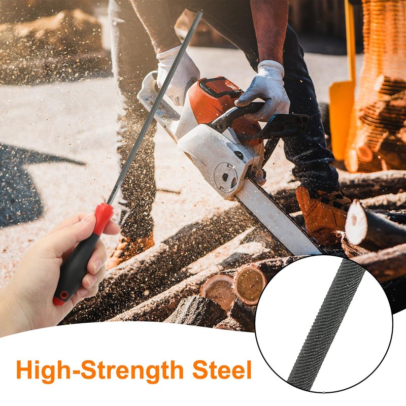 - [Material] - The chainsaw chain sharpening file is crafted from carbon steel using a high-temperature quenching method. It boasts strong hardness, sharp teeth, and excellent flexibility, all of which contribute to a precise and effective sharpening experience