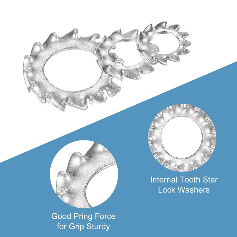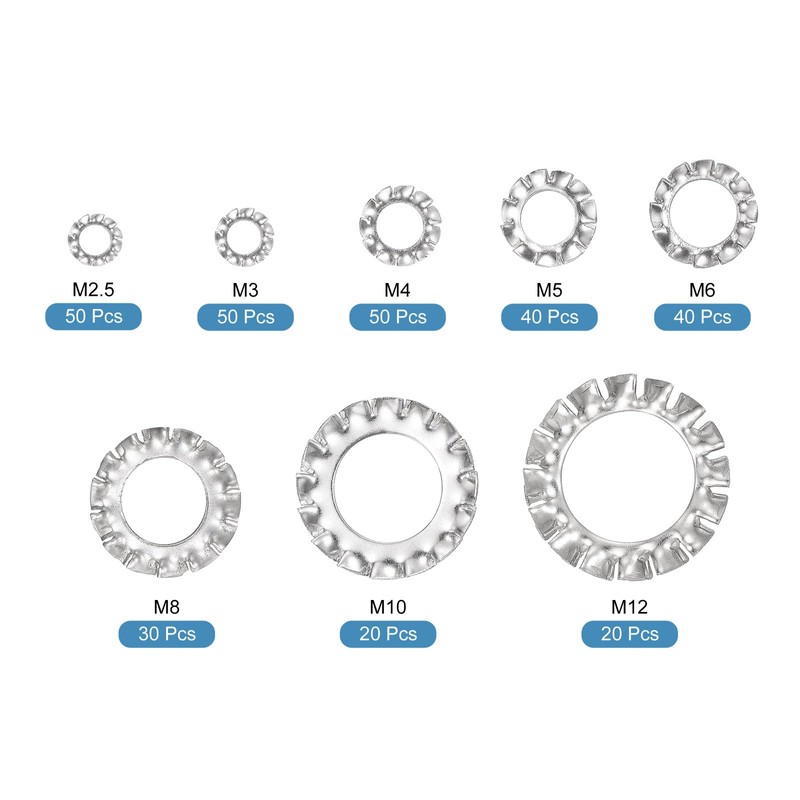 - [SIZE & PACKAGE]: Our External Tooth Tooth Washers have M2, M2.5, M3, M4, M5, M6, M8, M10, M12 specifications. The packaging includes 50pcs M2.5 External Tooth, 50pcs M3 External Tooth, 50pcs M4 External Tooth, 40pcs M5 External Tooth, 40pcs M6 External Tooth, 30pcs M8 External Tooth, 20pcs M10 External Tooth, 20pcs M12 External Tooth Washers.