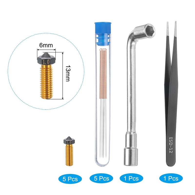 - Package Content: Includes 5pcs 1mm nozzles and 5pcs gold nozzle cleaning needles, come with a socket wrench and a tweezer for convenient use. Input Diameter: 1.75mm. Screw thread: M6.
