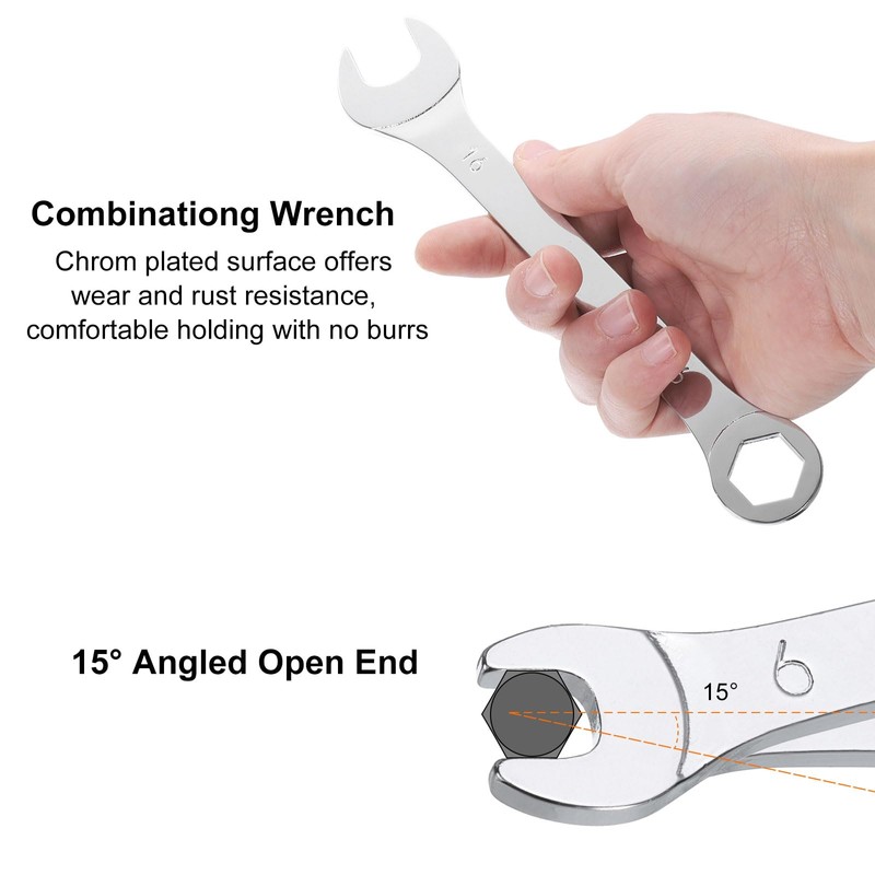 4. 15° Angled Open End: Provide you with an extra working swing arc when working in a narrow space, and can be flipped over for each rotation so that the fastener engages twice.