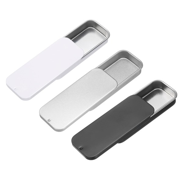 uxcell 3Pcs Slide Top Tin Containers, Metal Empty Tins Box with Sliding Lids, 3.1"x1.3"x0.4" Rectangular Storage Organizers for Lip Balm, Solid Perfume, Small Items, Black, White, Silver