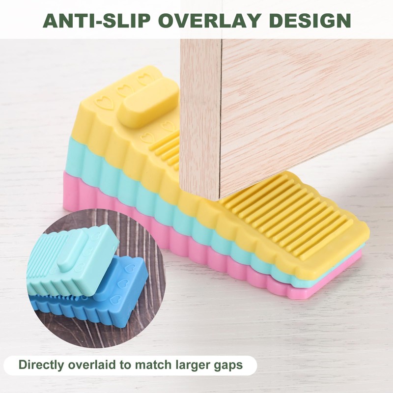 Anti-Slip Overlay Design - The door stopper can be directly overlay to match larger gaps; and has a double-sided anti-slip function, with a horizontal stripe design on the surface, which increases the friction with the door and can easily fix the position of the door. The bottom hollowed-out anti-slip design keeps the door stable on the floor, with even force distribution during use, and is not easy to move.